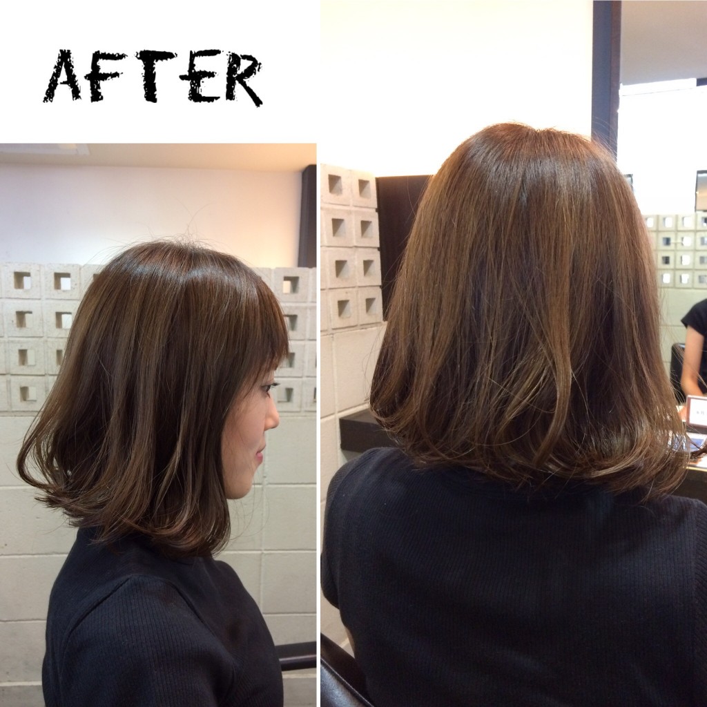 このロングを切りっぱなしボブにしたい!!とのこと。切りっぱなしボブはコテで巻くから可愛い。けど、Yさんのライブでライフスタイルからすると、毎日巻くのは大変なご様子でした。