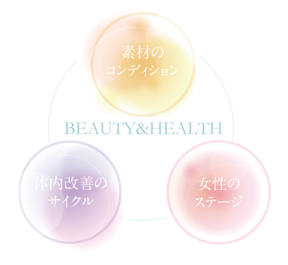 カラダを健康な状態に導くサイクルを生み出し、素材のコンディションを整えながら、世代に合った美容アプローチで心身ともに美しく健康的なライフスタイルへ導きます。