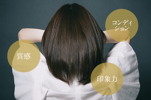 素材を美しくする本当の意味は、髪のコンディションが正常であること。素材に透明感、輝き、潤いなどの“質感”が生まれ、やわらかさ、しなやかさの印象をコーディネートし、素材のクオリティを上げていきます。