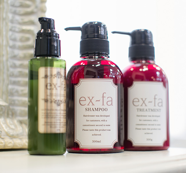 ex-fa独自のシステムトリートメントプログラムを一人ひとりの髪質に合わせて薬剤を調合し、ヘアデザインが美しく映える質感へ導いていきます。